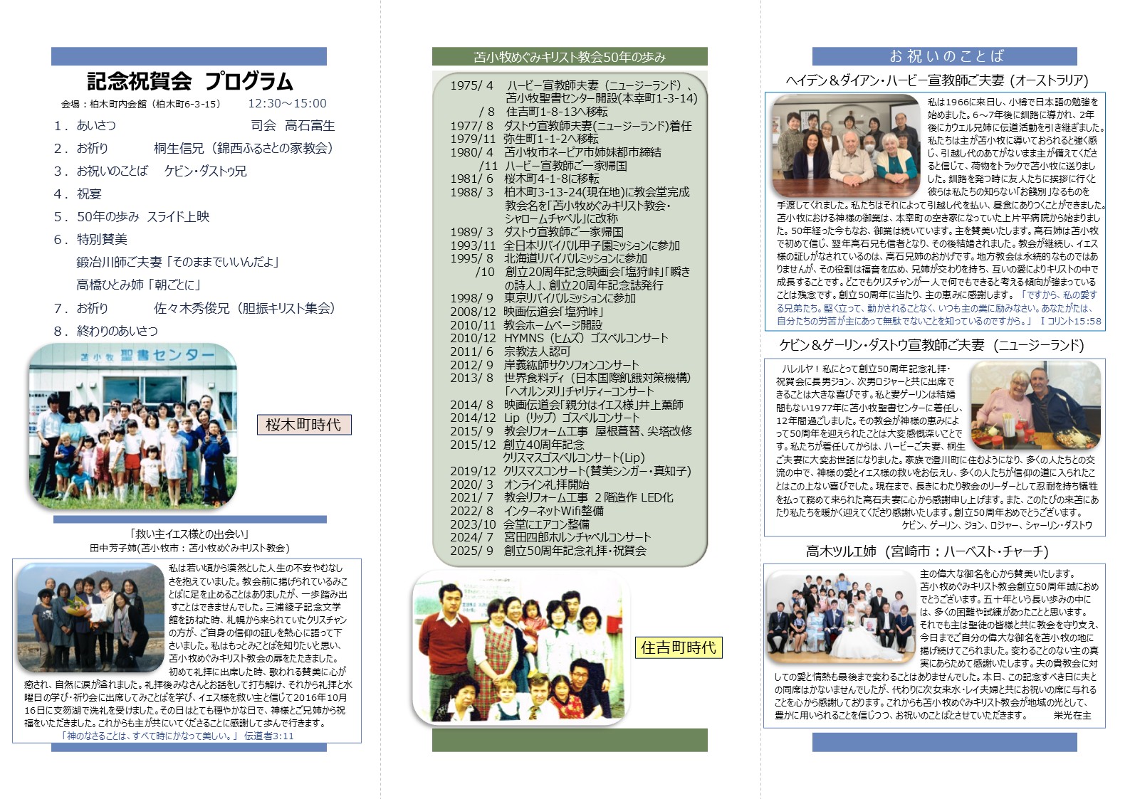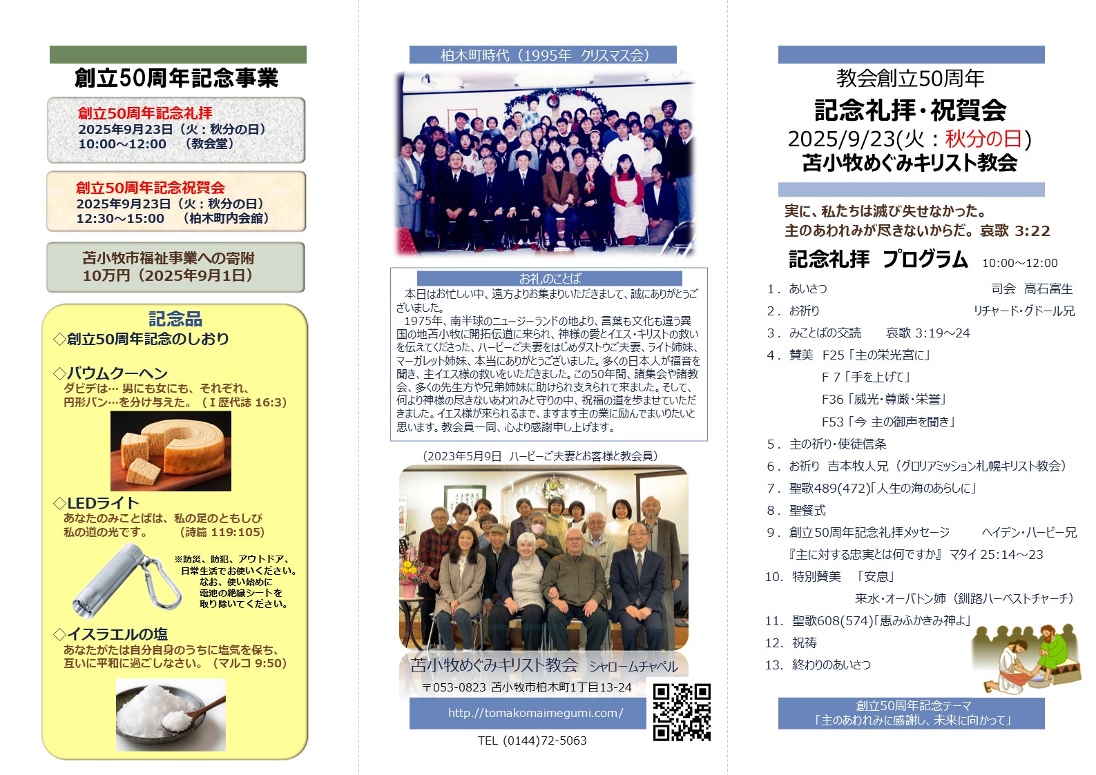 教会創立50周年記念 2025.10.05 苫小牧めぐみキリスト教会(旧苫小牧聖書センター)は、1975年にハービー宣教師夫妻によって開拓伝道が開始されて今年で創立50周年を迎えました。去る9月23日(火:秋分の日)にハービー宣教師夫妻、ダストウ宣教師、かつて在籍された兄弟姉妹、関係各位をお招きして、記念礼拝と祝賀会を開催することができました。これらすべてあわれみ豊な主と皆様のご協力とお祈りのおかげです。心より感謝申し上げます。創立50周年記念としてしおりを作成しましたので掲示させていただきます。